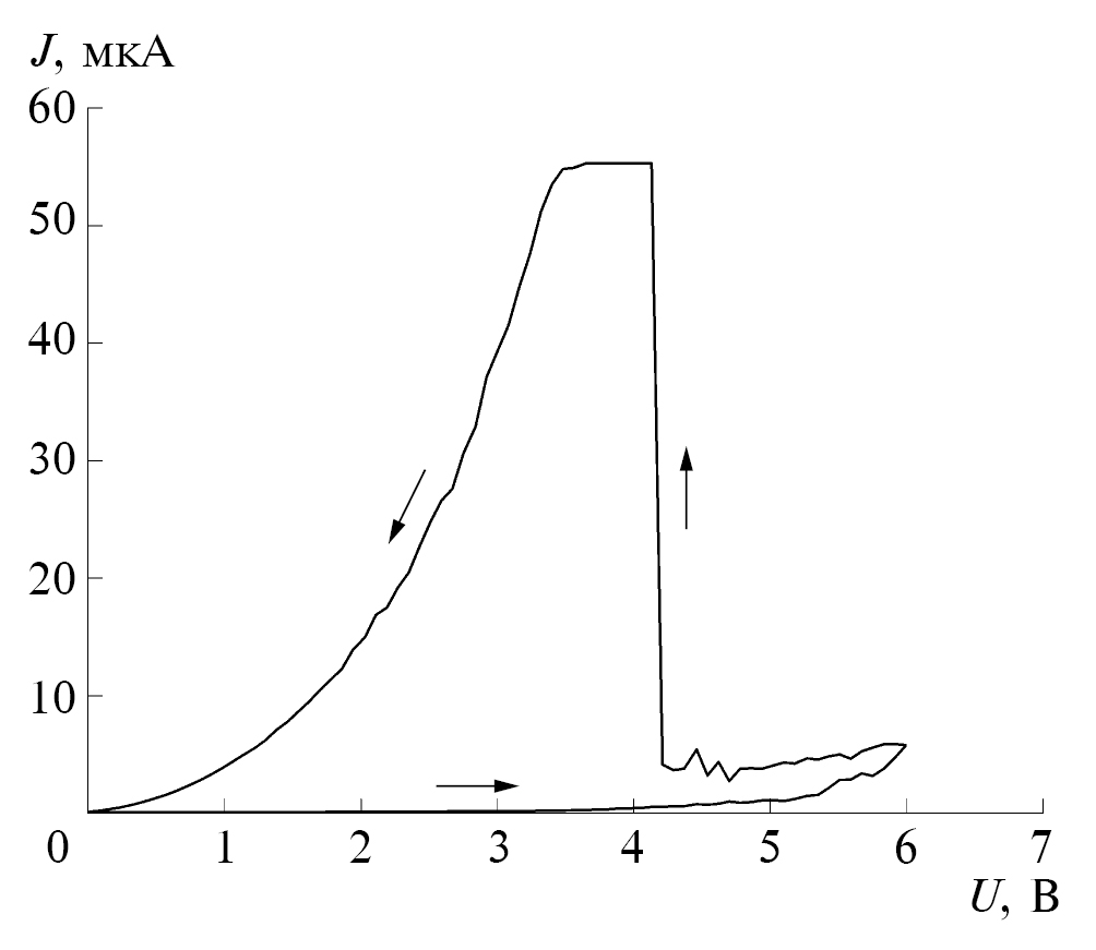 Электроформовка включала помещение структур в высокий вакуум (с остаточным давлением менее 10–2 Па, поскольку наличие кислорода в газовой среде при больших давлениях подавляет процесс электроформовки) и подачу на их электроды напряжения по определенному алгоритму. Использовали как “масляный” вакуум, создаваемый механическим и паромасляным насосами, так и “безмасляный”, получаемый с помощью турбомолекулярного насоса. На структуры подавали треугольный импульс напряжения (применяли прибор ИППП-1/2, управляемый персональным компьютером) с амплитудой 10–15 В и скоростью изменения напряжения около 2 В/с. Одновременно фиксировали вольт-амперную характеристику (ВАХ), что позволяло контролировать процесс электроформовки. Чтобы минимизировать вероятность пробоя структуры при резком нарастании тока, ток ограничивали на уровне 60–200 мкА с помощью внешней схемы. Типичная ВАХ процесса электроформовки показана на рис. 2. Резкий скачок тока происходит на обратном ходе напряжения, кривая становится N-образной, после чего структура остается в высокопроводящем состоянии (участок вблизи вертикальной оси).