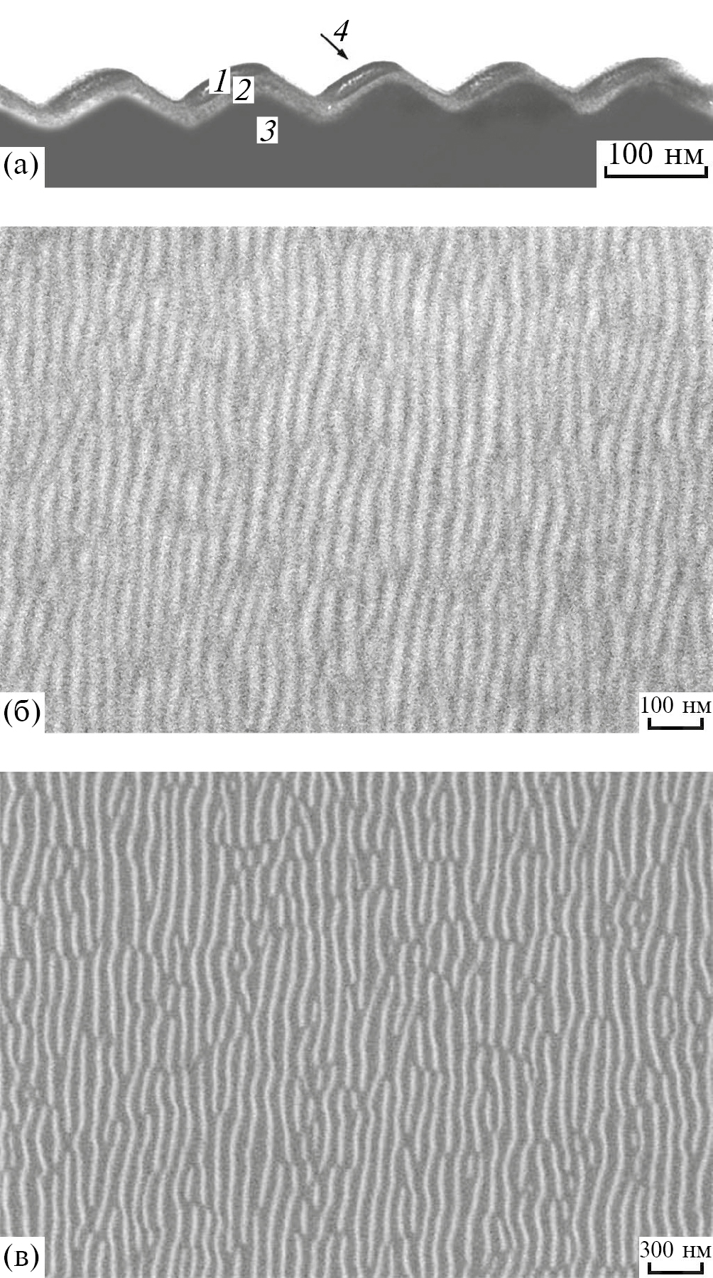 Рис. 1. Строение и топология волнообразной наноструктуры: а – ПЭМ-изображение поперечного сечения (λ = 130 нм) нанополосок из аморфного нитрида кремния a-SiN (1) и подслоя из аморфного кремния a-Si (2) на монокристаллическом кремнии c-Si (3), указано направление потока ионов азота (4); б, в – РЭМ-изображения (вид сверху), λ = 30 и 80 нм соответственно. Размер поля зрения по горизонтали: а – 700 нм; б — 1.32 мкм; в – 4 мкм.