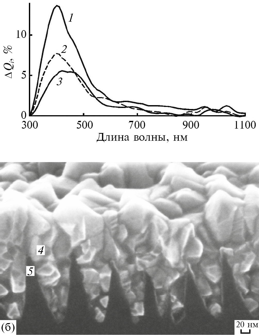 Рис. 4. Спектральная зависимость приращения внутреннего квантового выхода (∆Qi) для разных образцов прототипов солнечных элементов (1–3) на основе наноструктуры “черный кремний” (а). РЭМ-изображение скола образца солнечного элемента (вид под углом 70°): 4 — слой прозрачного проводящего оксида, облегающий острые вершины кремниевых нанохребтов 5 (б). Размер поля зрения по горизонтали 586.7 нм.