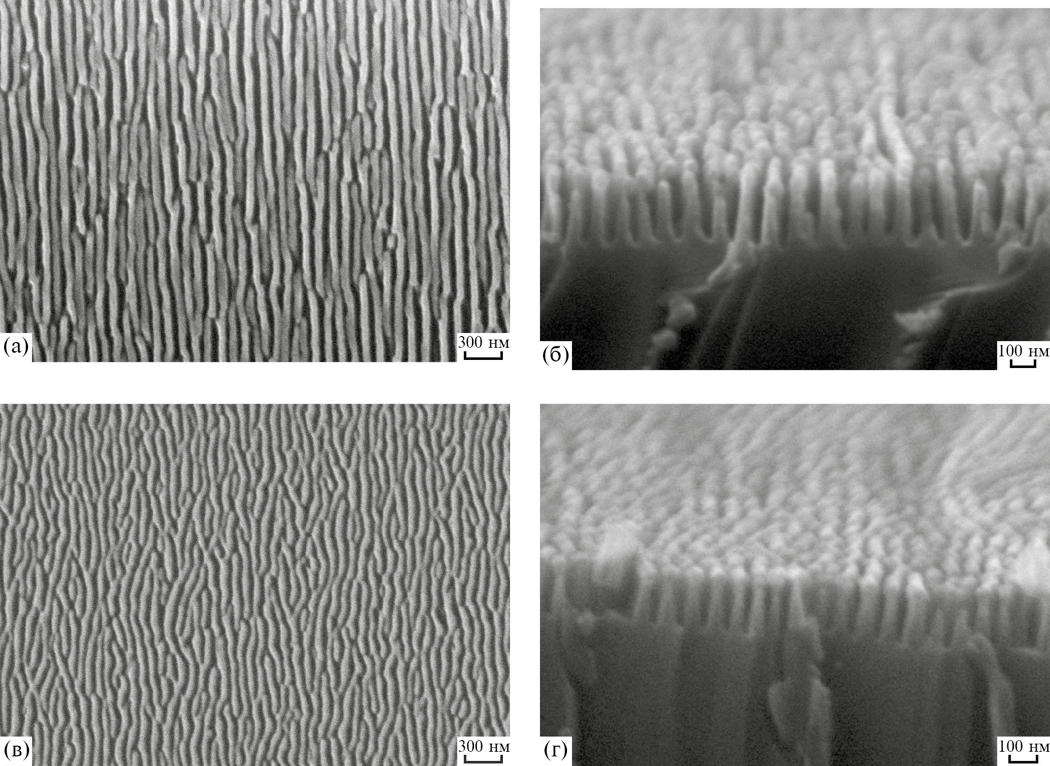 Морфологию волнообразной структуры и наноструктур, полученных на основе наномаски, в том числе сколы наноструктур, исследовали методом растровой электронной микроскопии (РЭМ) в микроскопах с умеренным (Zeiss LEO 430) и высоким разрешением (Zeiss Supra 40). Атомное строение образцов изучали методом просвечивающей растровой электронной микроскопии на приборе Philips EM 430.