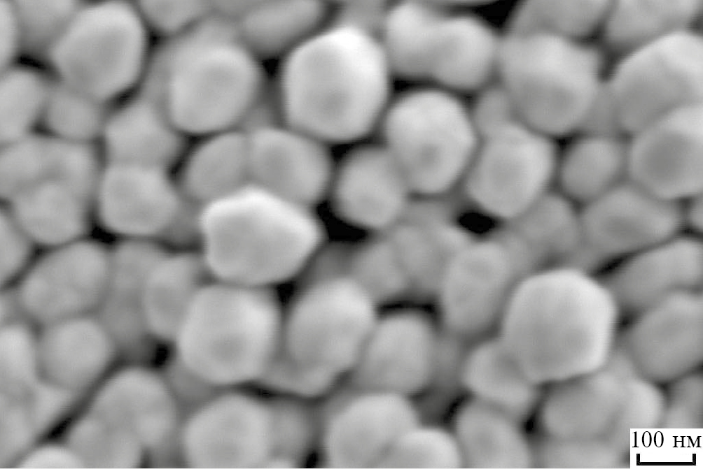 Рис. 6. РЭМ-изображение (вид сверху) образца подложки для поверхностно-усиленной КРС, полученной на основе плотного массива кремниевых нанопиков с напыленным слоем серебра. Размер поля зрения по горизонтали 1.2 мкм.