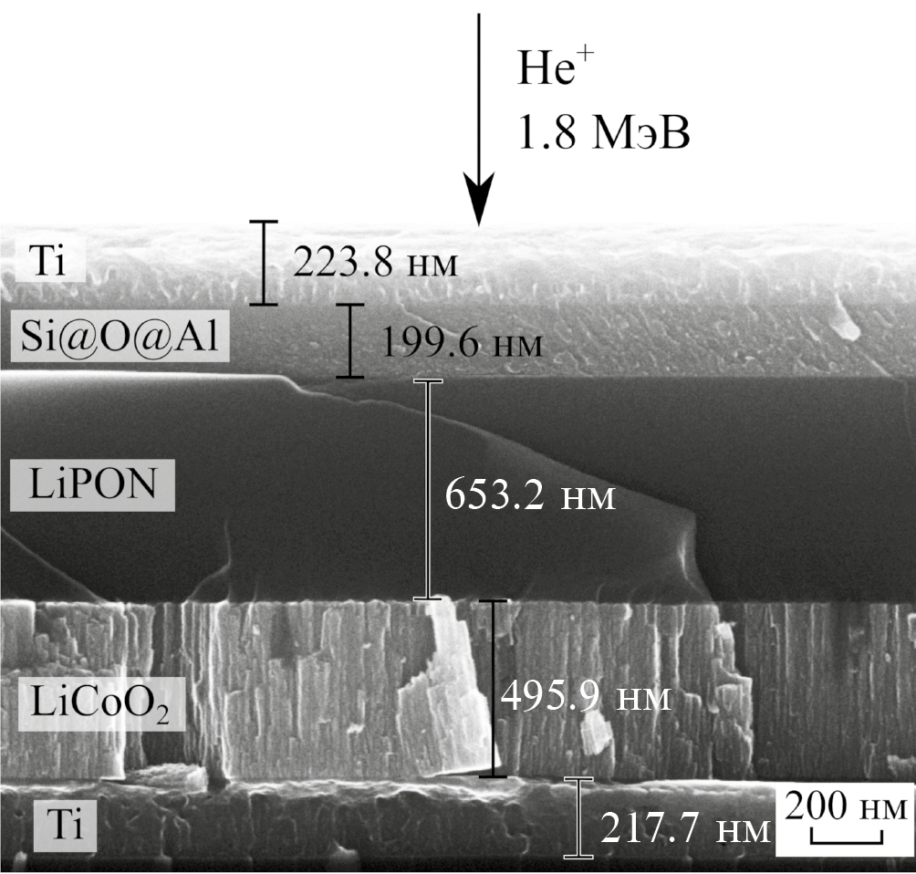 Твердотельный тонкопленочный литий-ионный аккумулятор (ТТЛИА) представляет собой многослойную планарную структуру, состоящую из катода, твердого электролита, анода и двух металлических токоотводов. Толщина отдельных слоев обычно не превышает 2.5 мкм, а толщина всего аккумулятора — не более 10 мкм (без учета подложки и изоляции). Благодаря своей конструкции, ТТЛИА являются удобными тестовыми структурами для изучения процессов, протекающих в литий-ионных аккумуляторах. При исследовании ТТЛИА возможно использование методов, неприменимых к аккумуляторам с жидким электролитом. Это послойный анализ методом вторичной ионной масс-спектрометрии (ВИМС) [1-3], растровая (РЭМ) и просвечивающая электронная микроскопия (ПЭМ). Последняя позволяет проводить исследования слоев на поперечном срезе ламели, выфрезерованной (milled off) сфокусированным ионным пучком (FIB) [4-7] и получать контрастные изображения функциональных слоев после утонения ламели в аргоновой плазме [8].