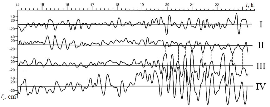 The instruments were hung from the board of the vessel and located at the following depths: 5–15 m – the first instrument; 15–25 m – the second instrument; 25–35 m – the third instrument; 35–60 m – the fourth instrument (indicated in Fig. 1 by Roman numerals I – IV, respectively).