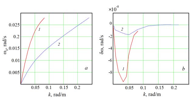 The boundary value problem (14), (15) is solved numerically using the implicit Adams scheme of the third order accuracy [34–43]. The shooting method is applied to determine the wave number and frequency imaginary part at a fixed wave period for a given mode of internal waves. The resulting solution is complex, as well as the wave frequency with a small imaginary part. Figure 3, a shows the dependence of frequency real part on the wave number for the first two modes. Figure 3, b reveals the dependence of the frequency imaginary part on the wave number. The imaginary part of first-mode frequency is negative, i.e. the wave is slightly attenuated.
