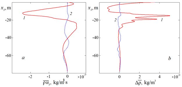 F i g. 5. Profiles of the vertical wave mass flux (a) and fine structure of density field (b) for the first (1) and second (2) modes of internal waves
