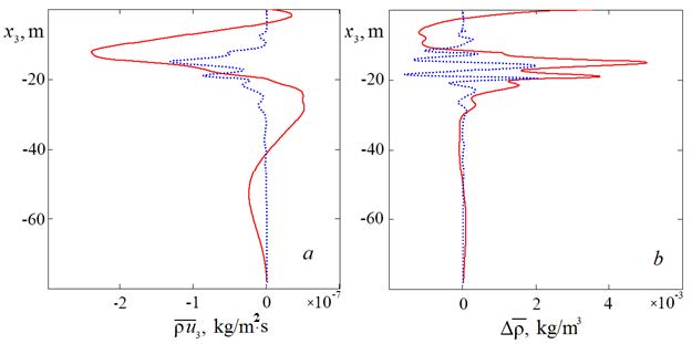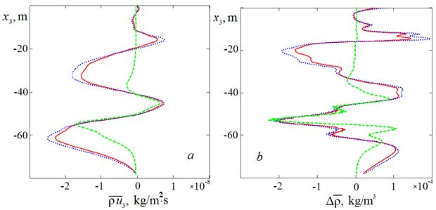 F i g. 6. Profiles of the vertical wave mass flux (a) and fine structure of density field (b) of the second mode for 15-minute internal waves (red curve), one-hour internal waves (blue curve) and 5-minute internal waves (green curve)