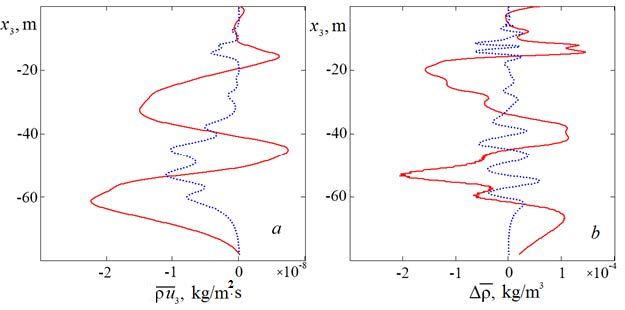 Figure 6, a shows vertical wave mass fluxes for waves of the indicated frequencies, and Fig. 6, b – profiles of the generated fine structure of the density field.