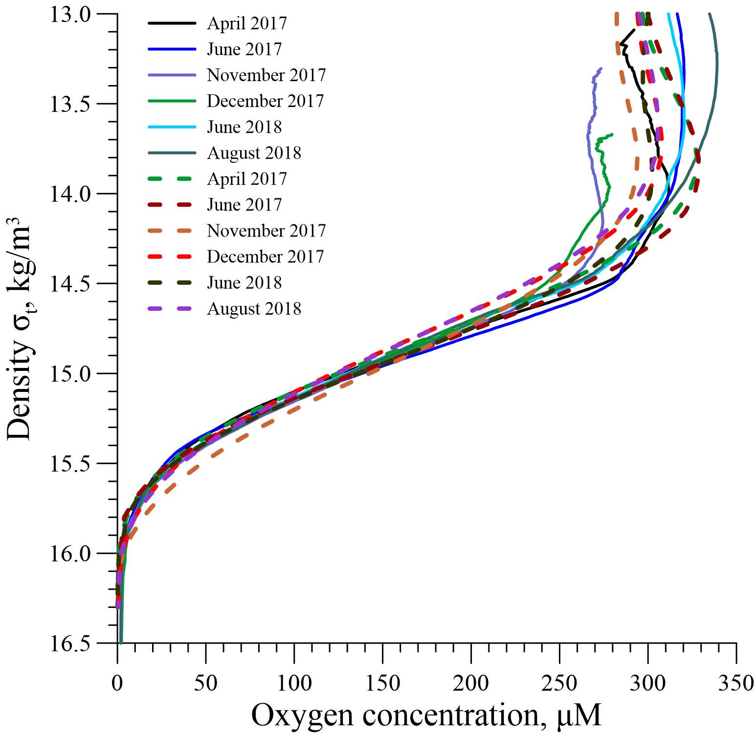 Vertical profiles of oxygen and hydrogen sulfide. Based on the vertical oxygen profiles obtained by averaging field data from six expeditions (dashed lines in Fig. 2), one can get the impression that in all cases the subsurface maximum of oxygen was observed and the beginning of oxycline (i.e. a noticeable decrease in oxygen concentration with depth) rose to the occurrence depth of isopycnal surface st = 14.0 kg/m3. However, when analyzing the oxygen sensor data (solid lines in Fig. 2), it becomes clear that the subsurface maximum of oxygen was observed only in April 2017 and the beginning of oxycline was still located near isopycnal surface st = 14.5 kg/m3 and was not subject to any seasonal changes since all four surveys in 2017 (April, June, November, December) showed that it remained at the same level.