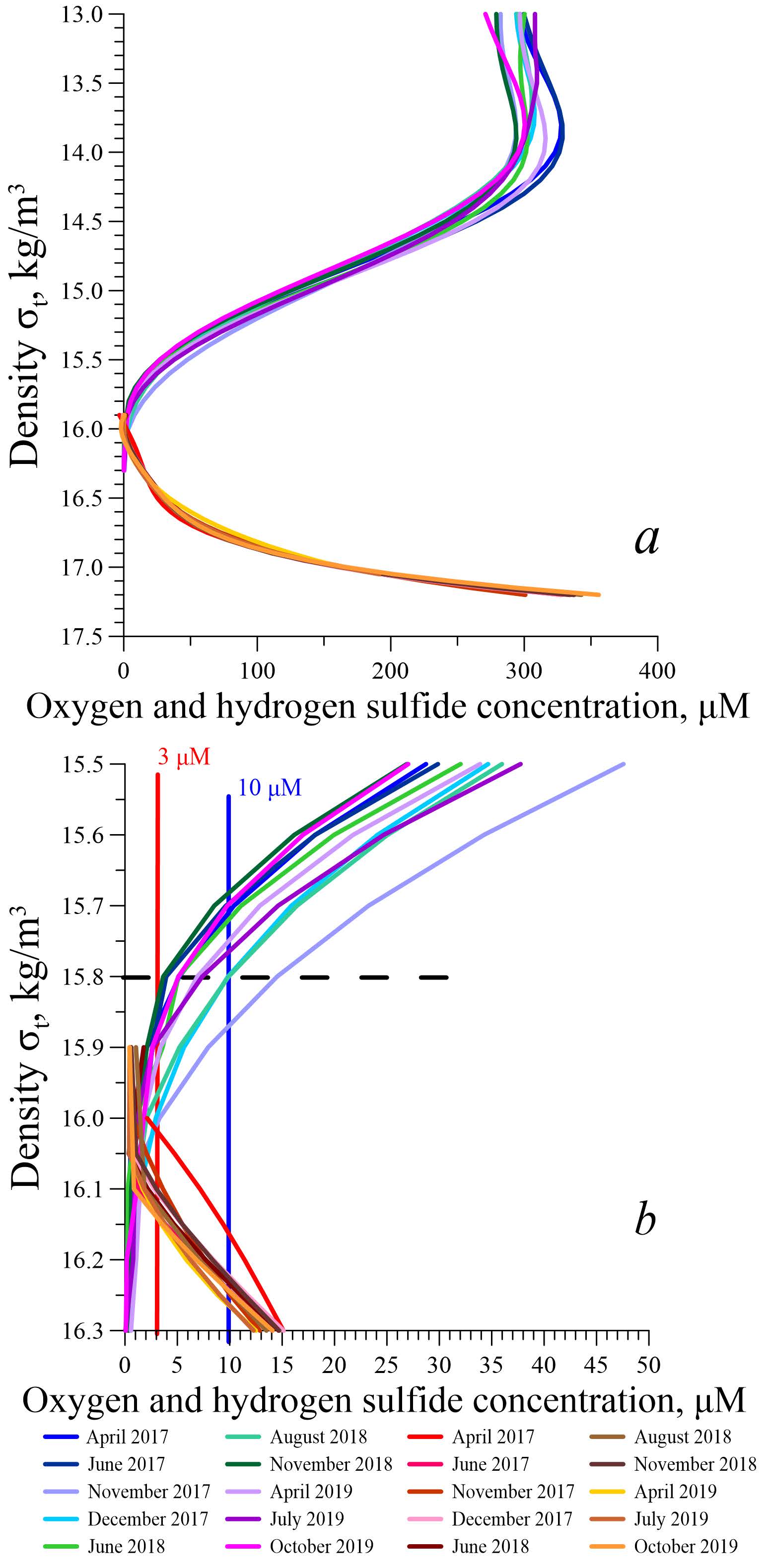 Further, the average vertical profiles of distribution of oxygen and hydrogen sulfide concentrations relative to the conventional density scale were calculated with a discreteness of 0.1 kg/m3 in conventional density range σt = 13.0 – 17.3 kg/m3 for each expedition. Averaging was carried out using the inverse distance method followed by additional smoothing using the low pass filtering method 2.