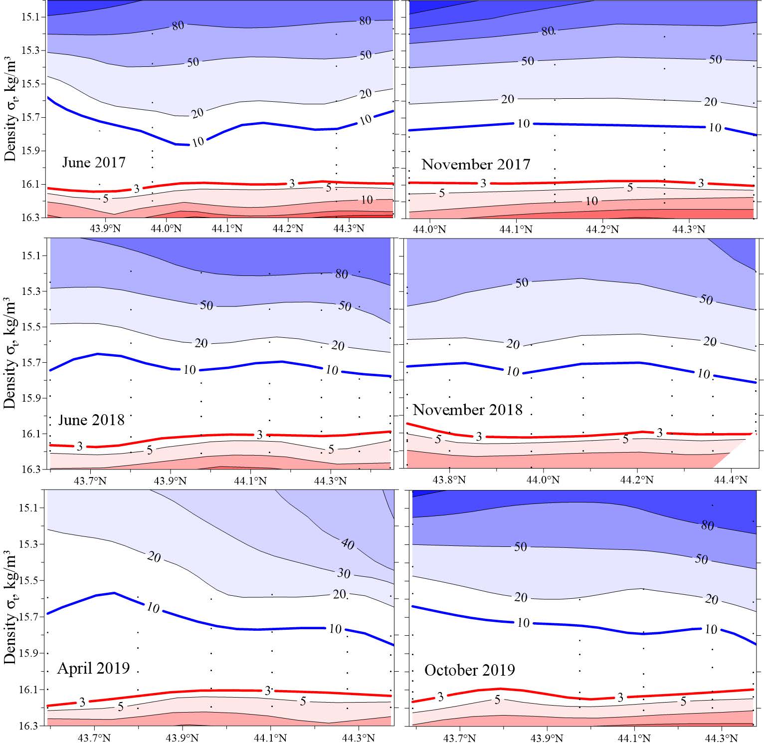 - The position of the sub-oxygen zone upper boundary determined by isooxygen 10 μM was not strictly isopycnal, but within isopycnal interval σt = 15.7–15.85 kg/m3. The deepest location of the upper boundary below σt = 15.8 kg/m3 was observed in November and December 2017, as well as in August 2018.