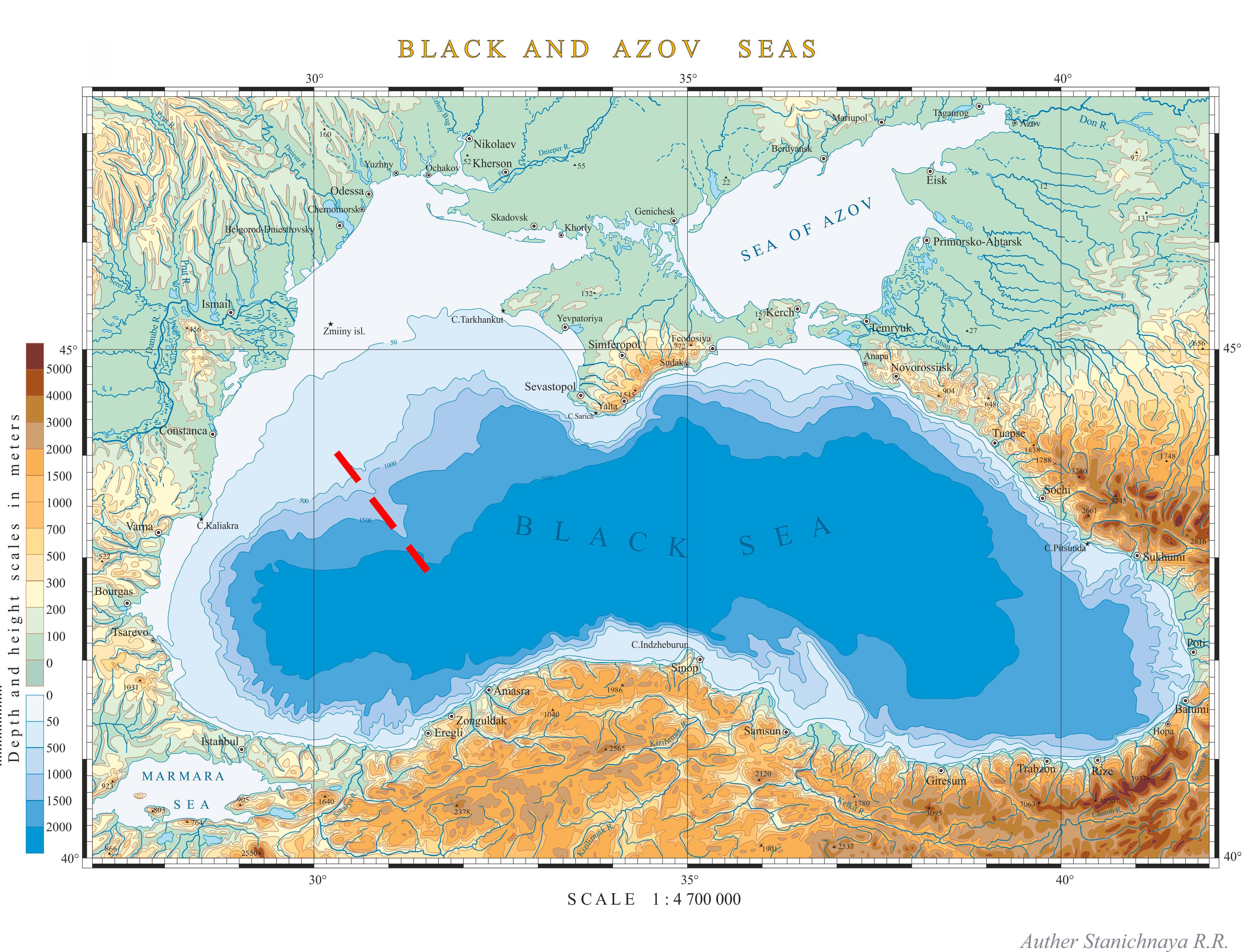 F i g. 1. Topography of the Azov-Black Sea basin (map was compiled by R.R. Stanichnaya). Red dotted line shows the along-slope ridge location in the western part of the Black Sea continental slope