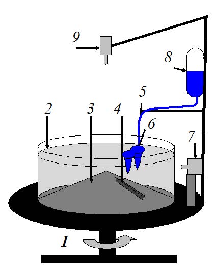 F i g. 2. Diagram of the laboratory set-up: 1 – cyclonically rotating platform; 2 – organic glass cylindrical tank; 3 – cone; 4 – ridge; 5 – tube; 6 – colored water flowing from the source and anticyclonic eddies formed under it; 7 – side-view video camera; 8 – volumetric burette with tap; 9 – top-view video camera (Adapted from sources 2, 3)