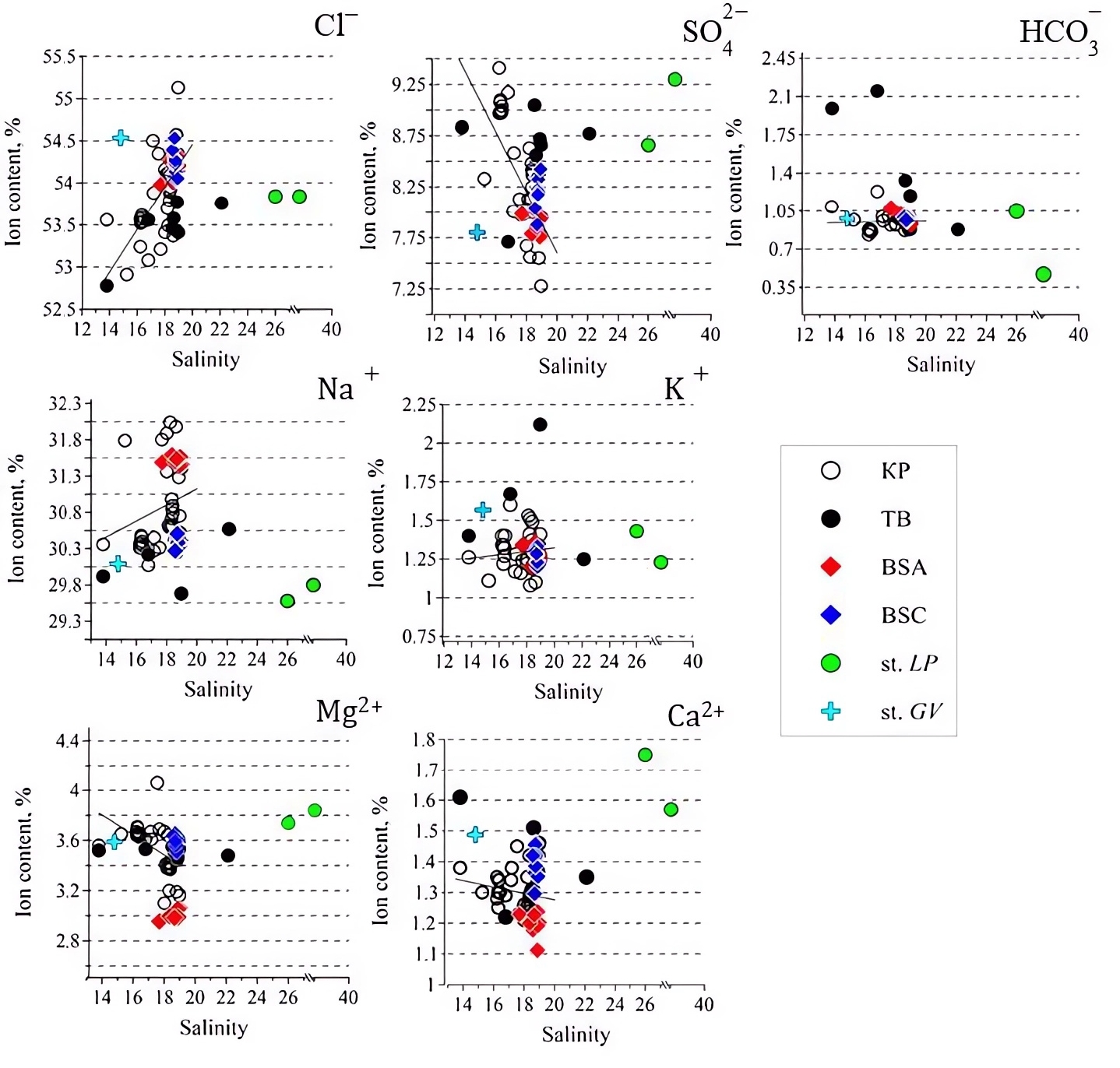 The Kerch Strait waters differ from the Black Sea ones in greater heterogeneity and seasonal variability of MIC (Fig. 2). It is shown that when the sum of ions is greater or less than 18.66 (sd = 0.3), their relative content changes. A relationship between the content of Na+ and Mg2+ is observed both in the Kerch Strait waters and at the BSA and BSC stages, which is associated with ion exchange processes at geochemical barriers when terrigenous suspended matter enters the sea with river runoff. Within each stage of the expedition, the Na+ and Mg2+contents were close. In the Kerch Strait waters, K+ was sometimes slightly less than in the Black Sea waters; the deviation of its values was ±0.5%. The Ca2+ content in the Kerch Strait and Black Sea waters was almost the same.