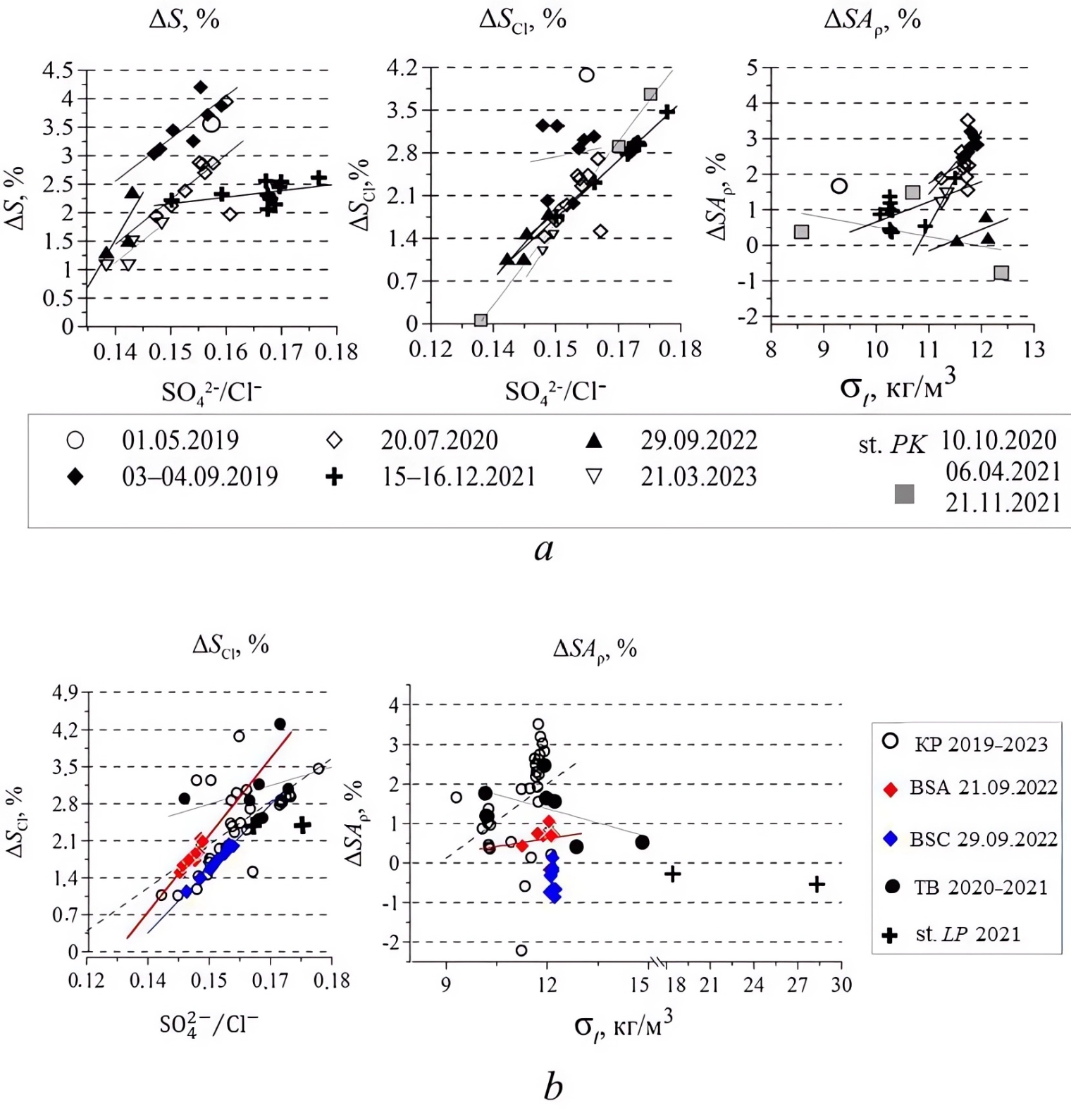 The hydrochemical MIC anomalies affect the accuracy of salinity calculations from electrical conductivity measured by a CTD probe, which leads to significant errors (up to 3%) [3]. Despite the fact that CTD probing was not carried out in the Black Sea waters of the BSA and BSC stages in 2022, some samples from the Kerch Strait with a sum of ions equal to ~ 18.8 have an ionic composition similar to the Black Sea waters and therefore ΔS component ~ 2.5% may also be typical for these waters. Due to the ΔSCl dependence on variations in salt composition, when determining salinity using the chlorine coefficient, it is necessary to take into account the ΔSCl correction equal to ~ 2% for the surface waters of the Black Sea and the Kerch Strait.