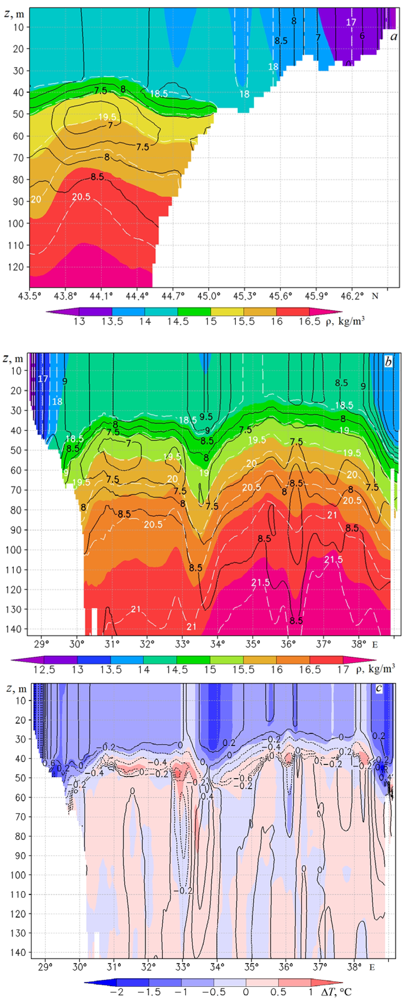 Fig. 4, a, b shows the vertical structure of temperature, salinity and density fields at vertical sections drawn along 31°E and 44°N before the start of the cold intrusion. Fig. 4, a, b confirms the idea that local cold waters in the shallow northwestern part of the sea are secondary as a source of CIL formation. Indeed, neither Fig. 4, a, b, nor other zonal and meridional vertical sections demonstrate signs of cold waters propagation from the coast towards the open part of the sea. The density of colder, though less saline, coastal water prevents it from sinking to the upper boundary of CIL, and its isolation from CIL is clearly visible.