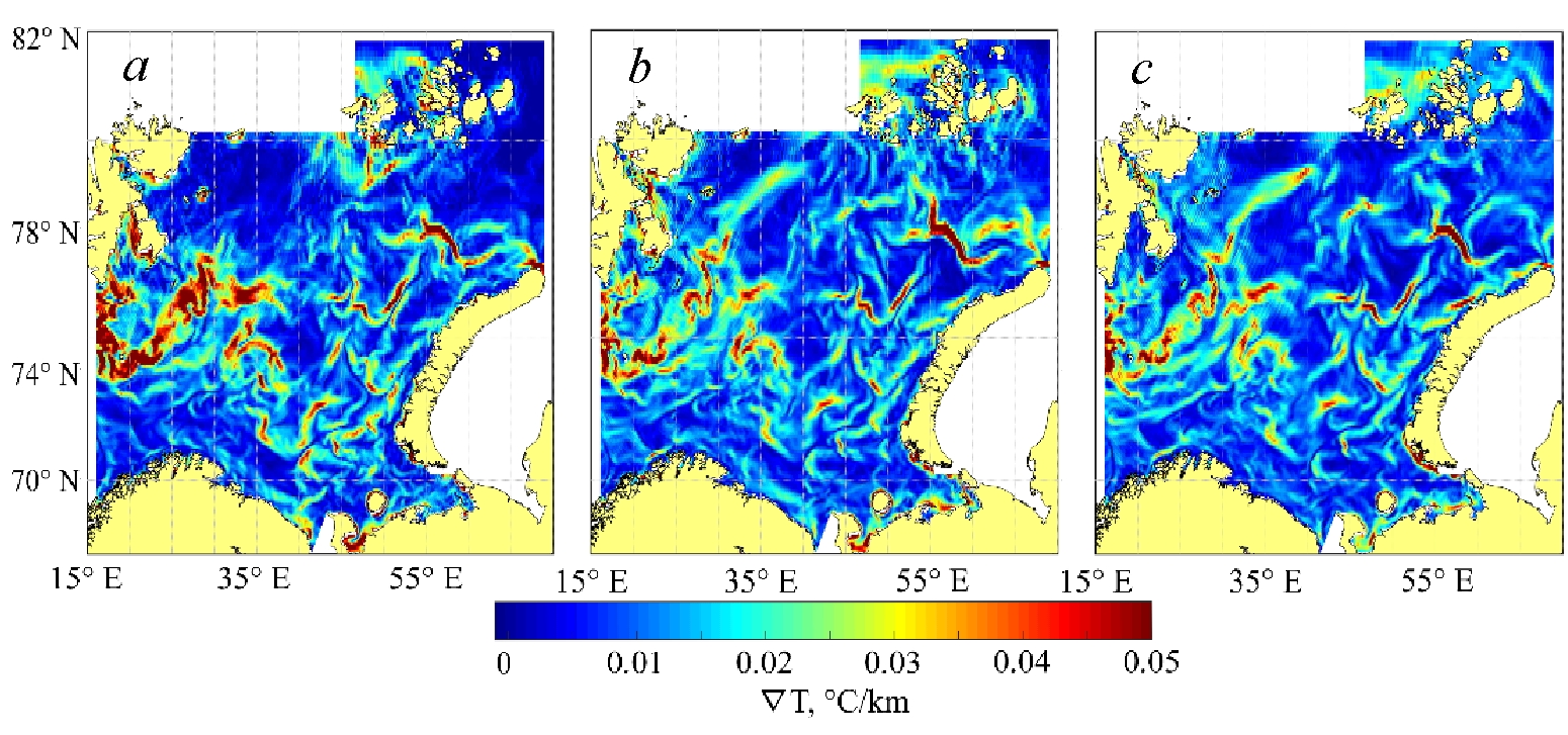 Determining the background horizontal gradient of the Barents Sea therefore currently remains an urgent problem which solution would help to improve the quality of assessment of the frontal zones variability in this region. Thus, the main purpose of this work is a comparative analysis of horizontal gradients of thermohaline fields in the Barents Sea calculated over decades from 1993 to 2022 for summer periods using satellite and model (reanalysis, forecast and assimilation) data.