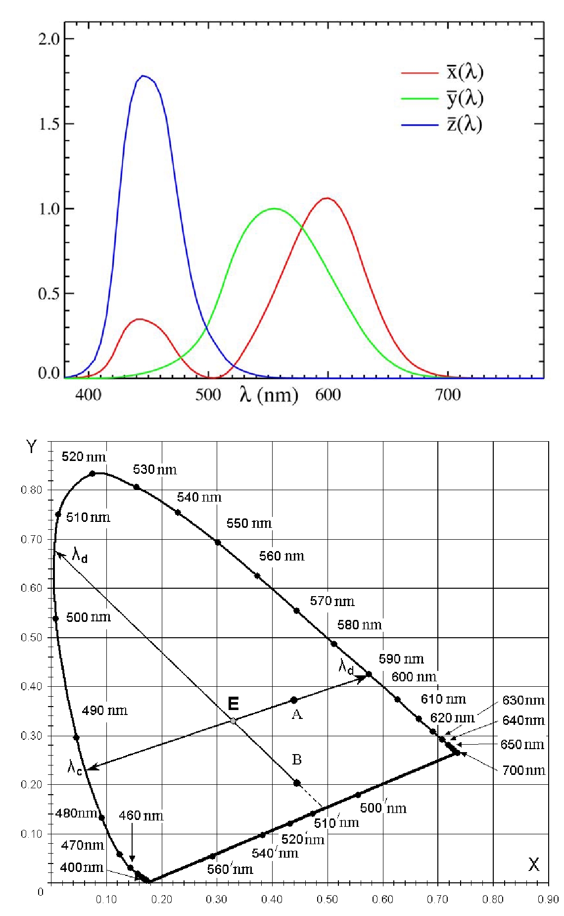 F i g. 1. Spectral sensitivity functions for a standard observer according to CIE 1931 5 [1] (top); color triangle in x, y coordinates 6 (bottom): point E is the white color; points A and B are some arbitrary colors; λd is the position of dominant wavelength