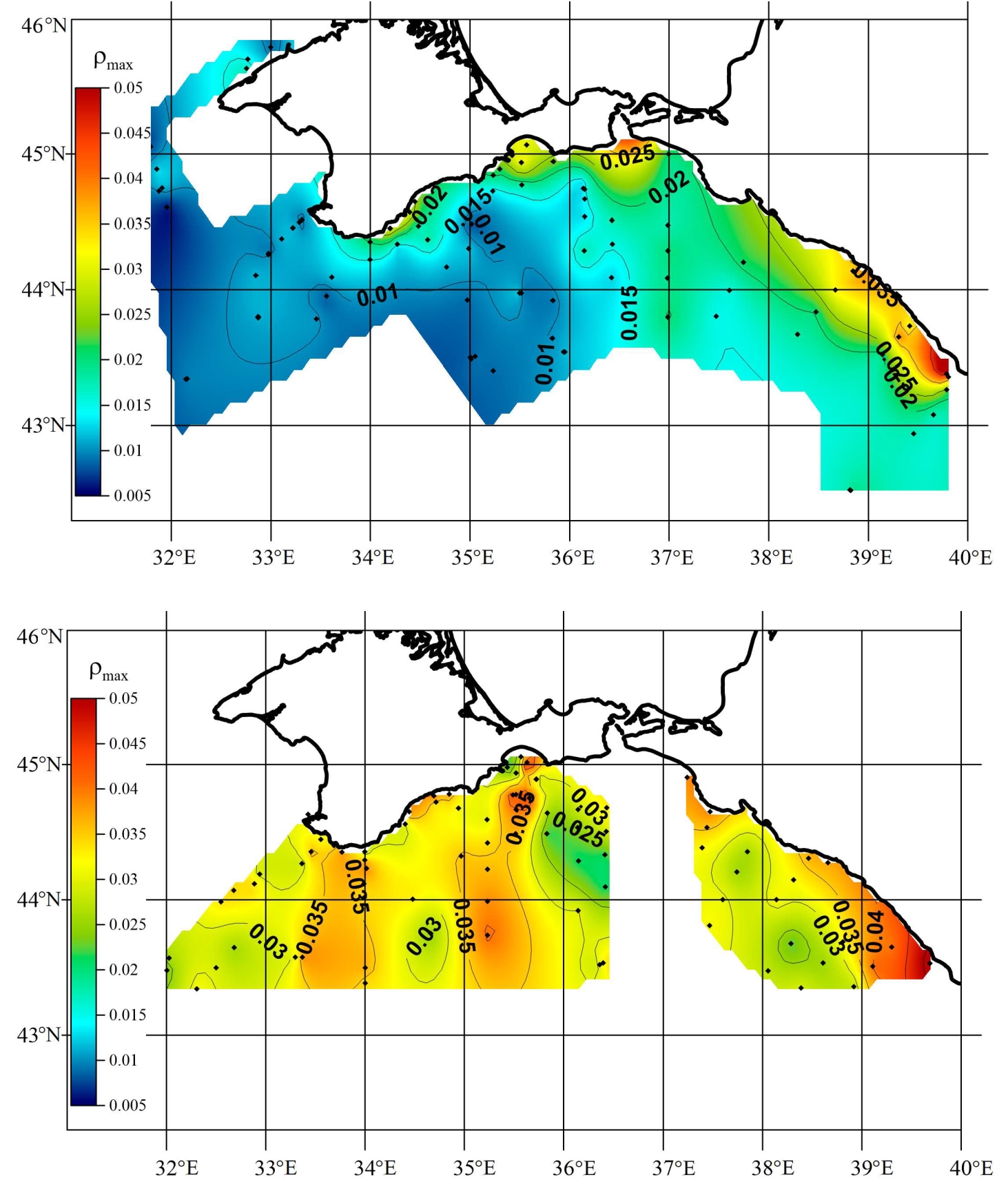 It should be noted that the division into regions was carried out differently than in paper [3]. Near the Caucasian coast, the shelf zone with depths of up to 200 m extends 5–6 km off the coast and river plumes propagate beyond it. Therefore, 1000 m isobath that is located, on average, 15 km off the coast was chosen as the coastal zone boundary. In the previous paper, the “eastern part” was different (the area east of 37°E). In the present paper, part of this area was included in the “central deep-sea part.”