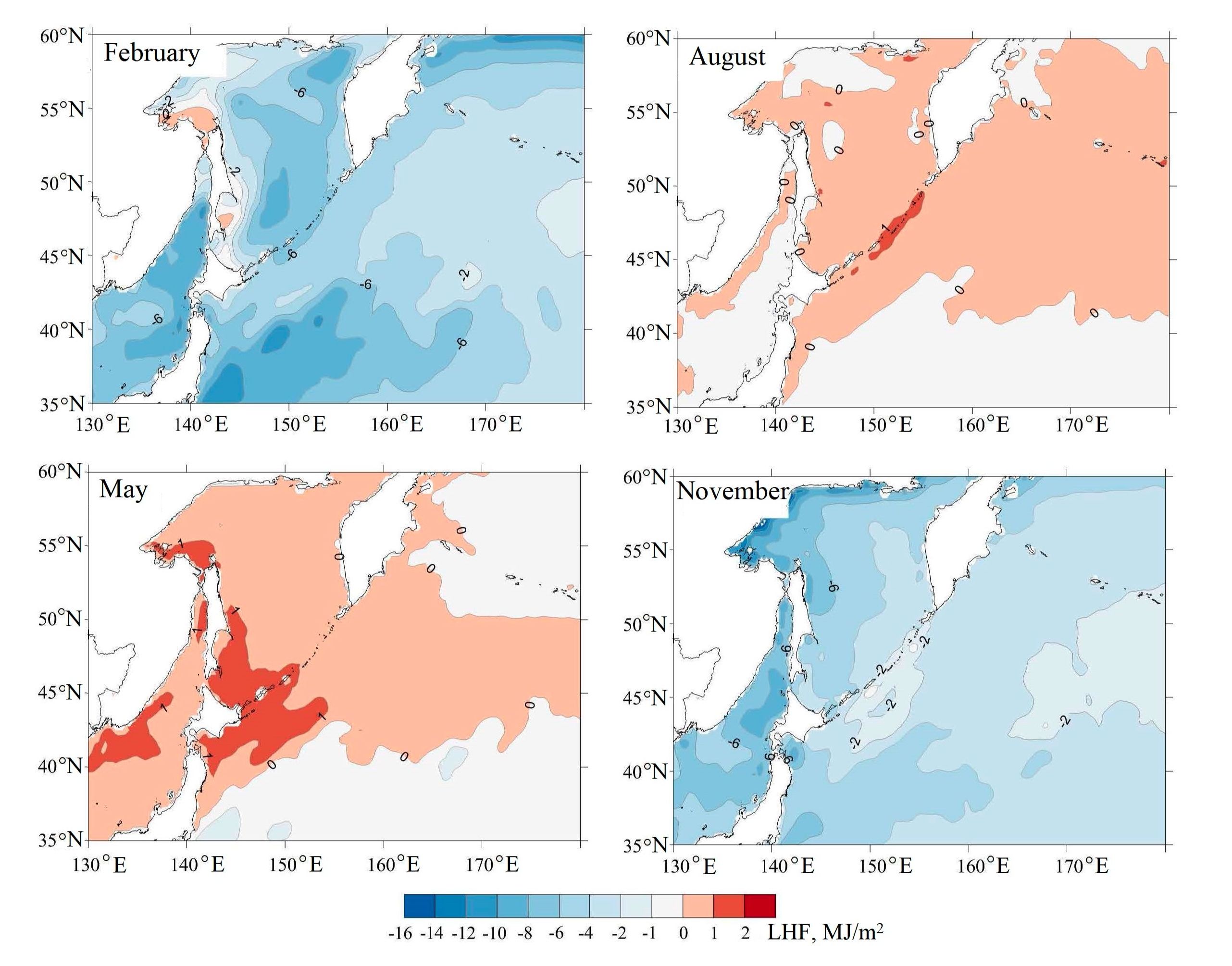 The Northwest Pacific Ocean and the Far Eastern seas represent an active fishing area of the Russian fishing companies in the Far Eastern region. A significant number of pelagic fish species, such as Pacific salmon, saury and Far Eastern sardine, are caught here. Most of these species are sensitive to the thermal conditions of their habitat. Changing climate conditions determine the importance of the study of various factors influencing the temperature of the surface water layer in these areas, including the spatial and temporal variability of the heat balance and its elements. One of the important components of this balance is the latent heat flux (LHF). Its data can be obtained on several web pages giving reanalysis materials of various hydrometeorological parameters.