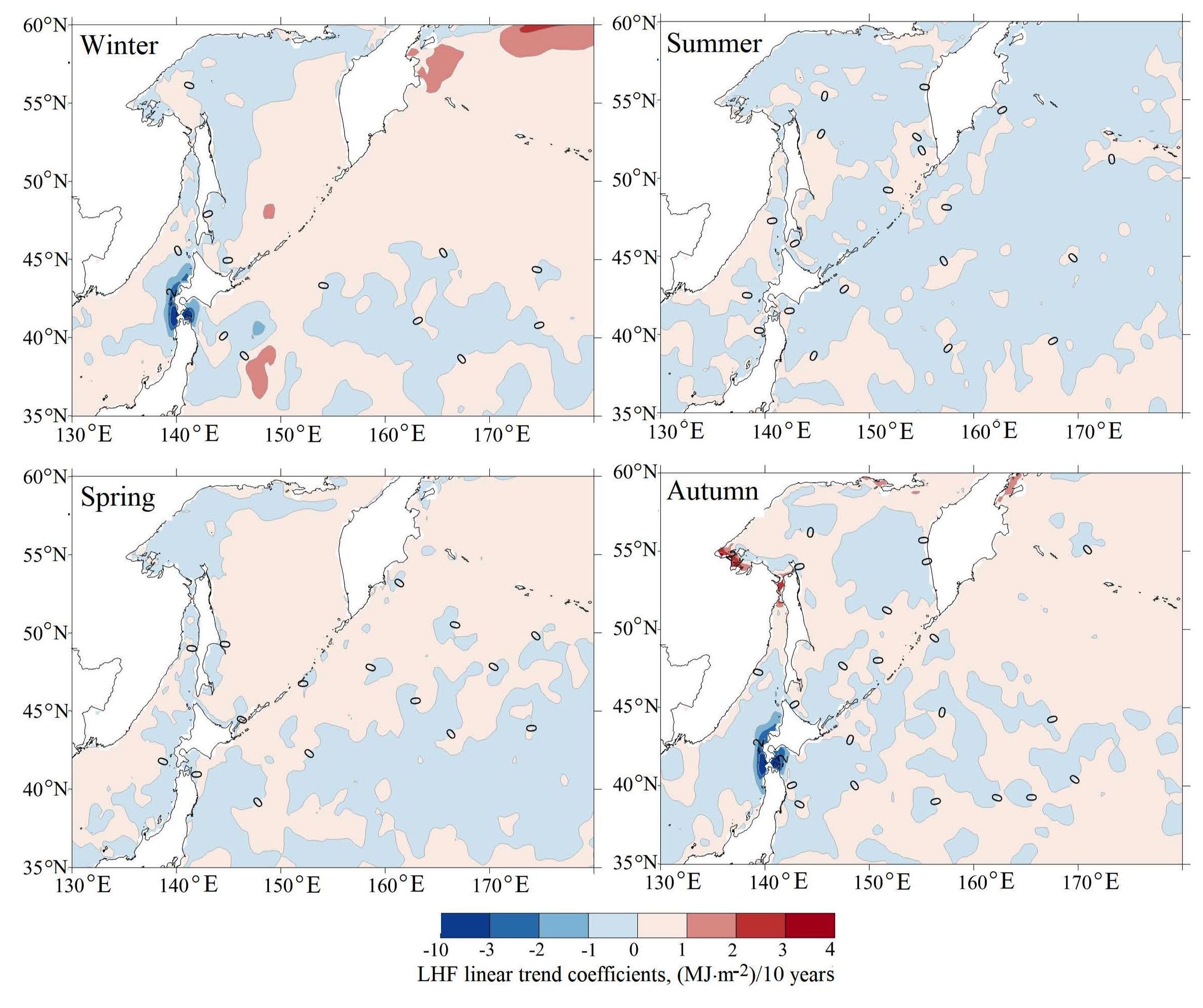 It is important to emphasize that the highest LHF values were found in autumn and winter in areas with the highest sea surface temperatures (SST), in the zone of influence of the warm Kuroshio and Tsushima Currents, associated with an increase in the temperature contrast between the atmosphere and the ocean surface in the cold season (the similar effect was also noted in the western part of the Barents Sea, in the zone of influence of the warm Gulf Stream [6]). This is largely determined by the effect of the winter monsoon characterized by high wind speeds carrying drier and colder air from the mainland than the summer monsoon brings from the central regions of the Pacific Ocean. The results obtained are consistent with the conclusions of [5, 7] in which the area east of Honshu is noted as one of the most energetically active areas of the atmosphere and ocean. Positive values of the parameter in areas of quasi-stationary upwelling also have a simple physical explanation, since moisture condensation can appear in them due to the lower temperature of the ocean surface.