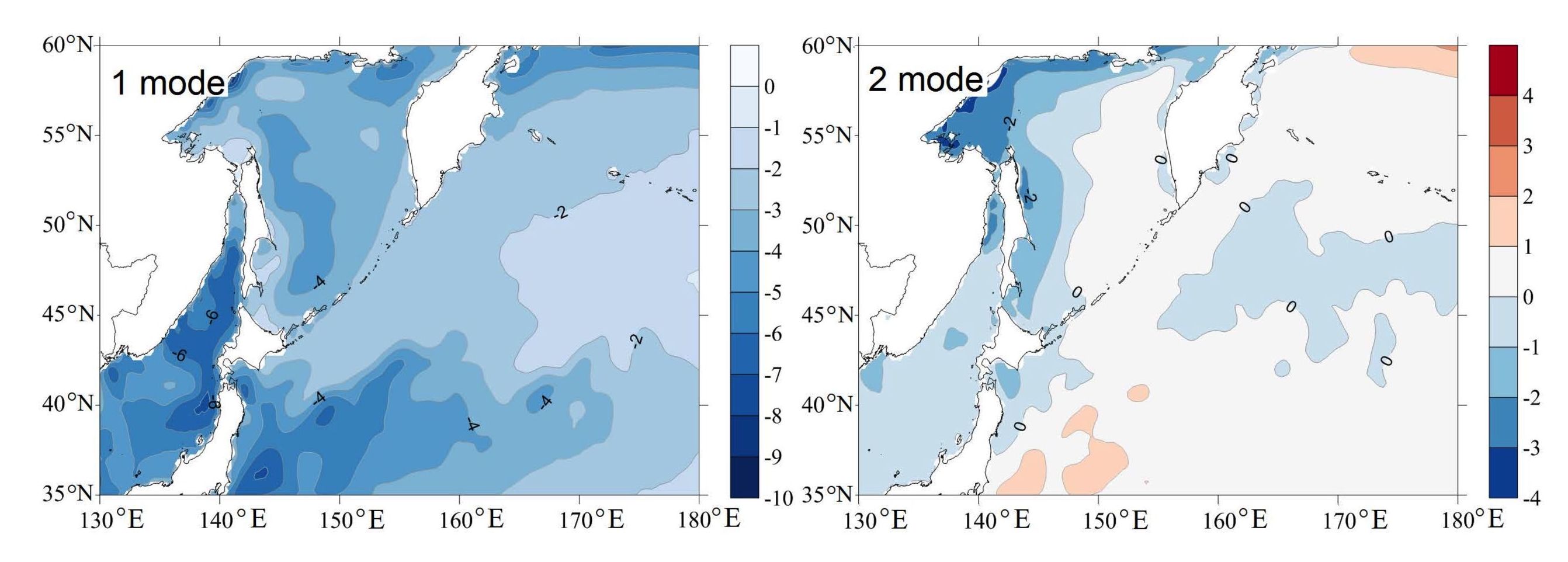 Decomposition of LHF in terms of EOF. The EOF decomposition method is often used for a detailed study of the spatial and temporal variability of hydrometeorological fields [8]. Fig. 4 shows the spatial functions of the first two modes of decomposition of the sequence of the LHF time layers using this method. The first mode is the main one accounting for 94.5% of the total variance of the parameter. Its spatial distribution (all values are negative, assumed to be dimensionless) is quite simple; values of ~ −5 are noted in vast areas of the northeastern part of the Northwest Pacific Ocean, in the Bering Sea, in the eastern and central parts of the Sea of Okhotsk. In the north-west of the latter, the smallest absolute values from −2 to −3 were identified and the highest ones were noted in the Sea of Japan off the western coast of Japan (from −10 to −12) and in the south of the considered part of the Northwest Pacific Ocean (up to −20 at Honshu eastern coast).