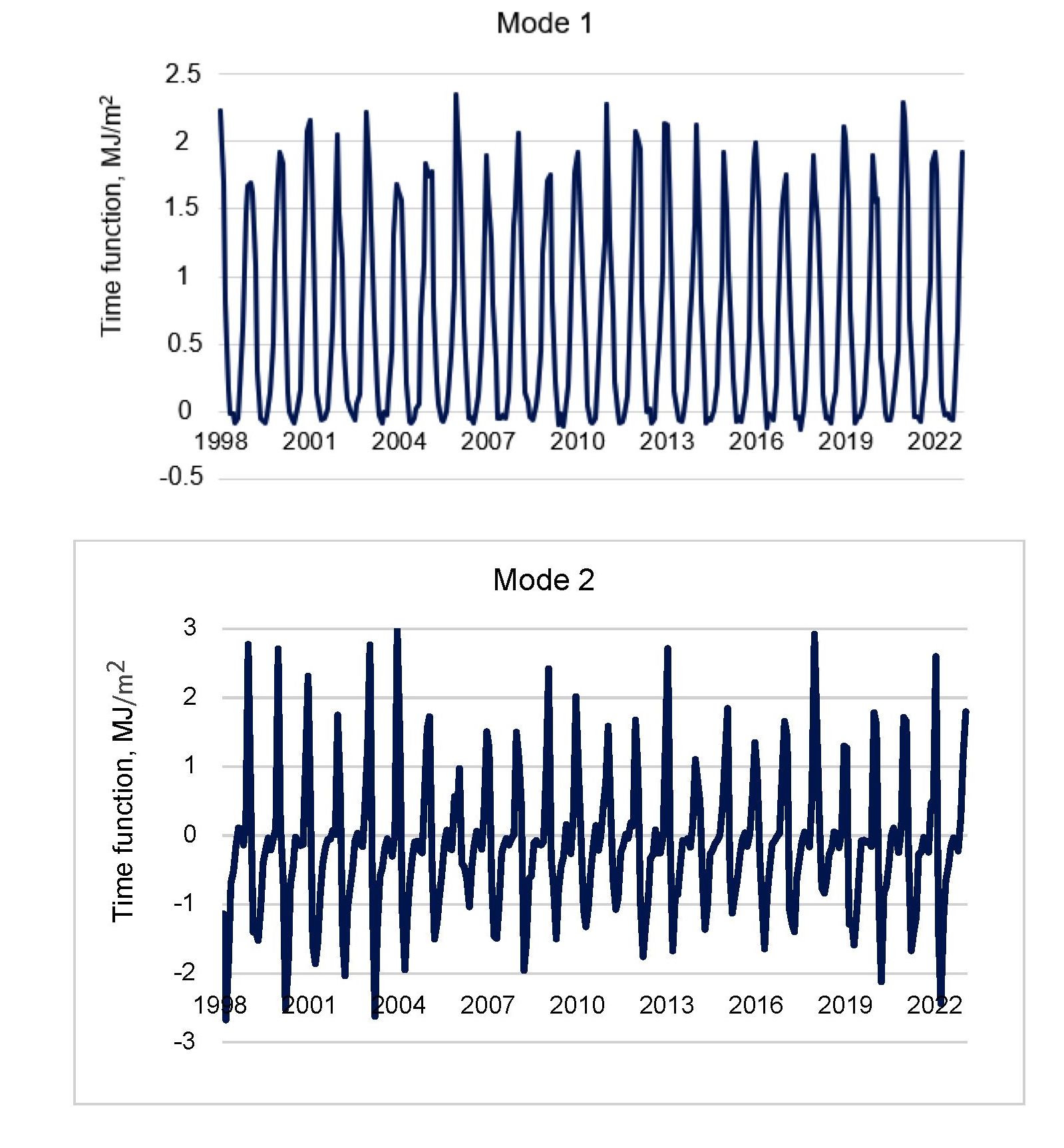 The time function of the main mode (Fig. 5) has a pronounced annual variation with maximum values in December and January (a little more and a little less than 1.5 MJ/m2) and minimum values in July and June (about 0.2 MJ/m2). It is well described by the annual cycle with an amplitude of 0.7 MJ/m2 and a phase of 334° which corresponds to the above noted maximum in December. It is characterized by low-frequency modulation, most pronounced for winter maxima, with a period of about 6 years. The highest function values in December 2020 (1.84 MJ/m2) and 2005 (1.79 MJ/m2) stand out noticeably.