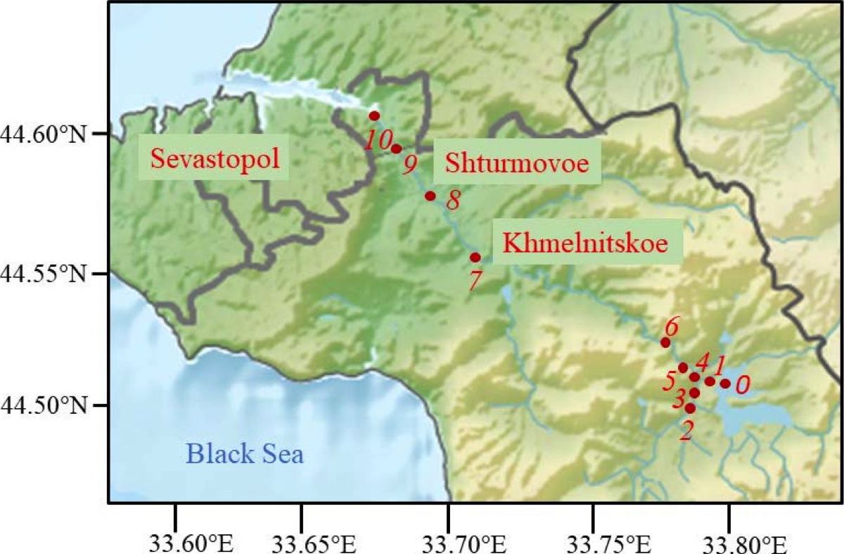F i g. 1. Location of long-term monitoring stations of the Chernaya River: station 0 – reservoir mirror above the water intake; station 1 – water intake under the reservoir; station 2 – the Baydarka River, former pond; station 3 – culvert under the road in Ozernoe village; station 4 – the Urkusta River (tributary from the pond in Peredovoye village); station 5 – automobile bridge between Ozernoye and Peredovoe villages; station 6 – gauging station at Red Rock; station 7 – gauging station by Khmelnitskoe village; station 8 – automobile bridge by Shturmovoe village; station 9 – railway bridge near Inkerman; station 10 – automobile bridge near Inkerman