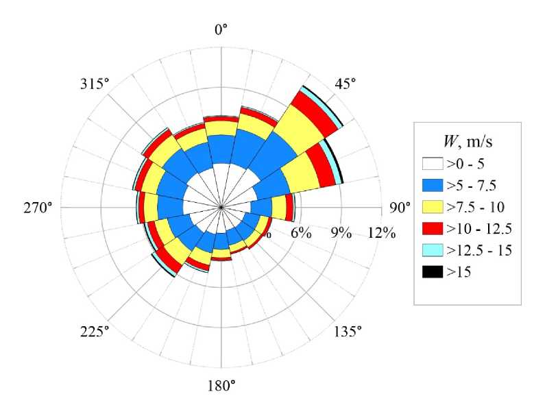 The wave climate has a decisive effect on the lithodynamic processes in the area of the Lake Sasyk bay-bar. For its study, the data of wind wave reanalysis in the Black Sea for the period 1979–2022 (hereinafter referred to as the SWAN-ERA array) were applied. The array was obtained using SWAN 7 model on an unstructured computational mesh with thickening in the coastal zone [8]. ERA-Interim and ERA5 reanalysis data from the apps.ecmwf.int website were used as atmospheric forcing. The computational grid node closest to the technological structure with a depth of ~6.8 m was selected from SWAN-ERA array and long-term series including speed W and direction of wind, significant wave height , mean wave period , mean wave direction were formed. The discreteness of series was 1 hour.