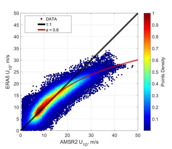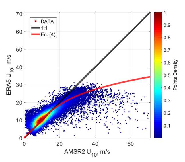 Building on the methodology, presented in section 2.1, we propose a simple and efficient exponential function to adjust the ERA5 wind speeds to the AMSR‑2 wind speeds: