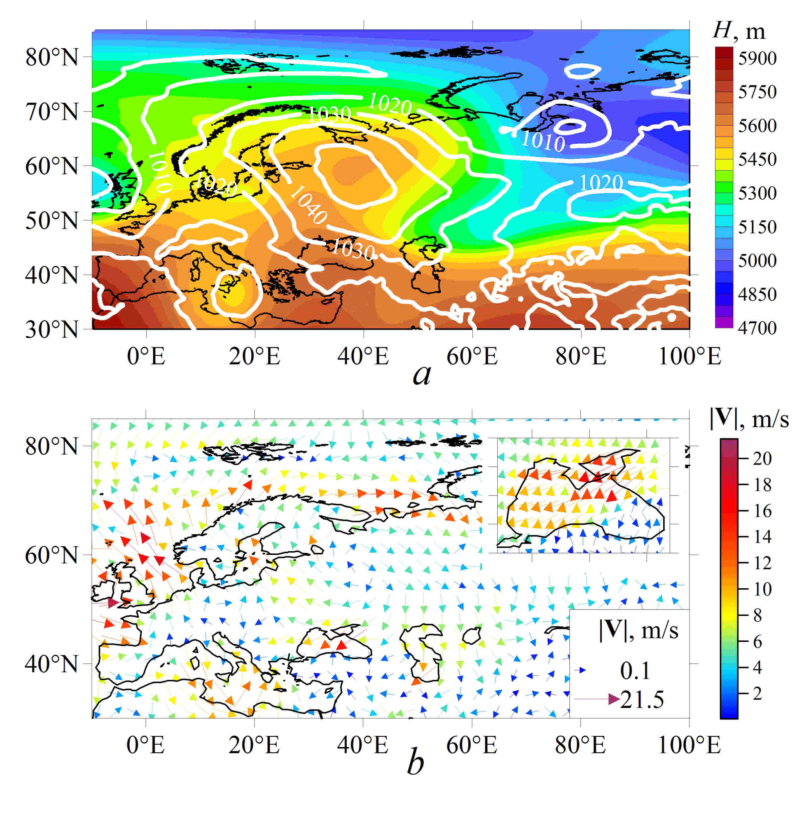 Decomposition of the set of surface pressure fields into empirical orthogonal functions yields similar results. In the spatial structure of the first mode, a vast area of positive surface pressure anomalies is located over Central Europe and the European part of the Russian Federation in all seasons (Fig. 1, b); the first mode accounts for 47% of the surface pressure field variability at that. The contribution of subsequent modes, from the second to the fifth, of the surface pressure field for all cases of steady winds was 21, 9, 5, and 4%, respectively, in the cold season. Note that due to the greater spatiotemporal variability of surface fields, contribution of the leading first mode is less than that in the mid-troposphere.