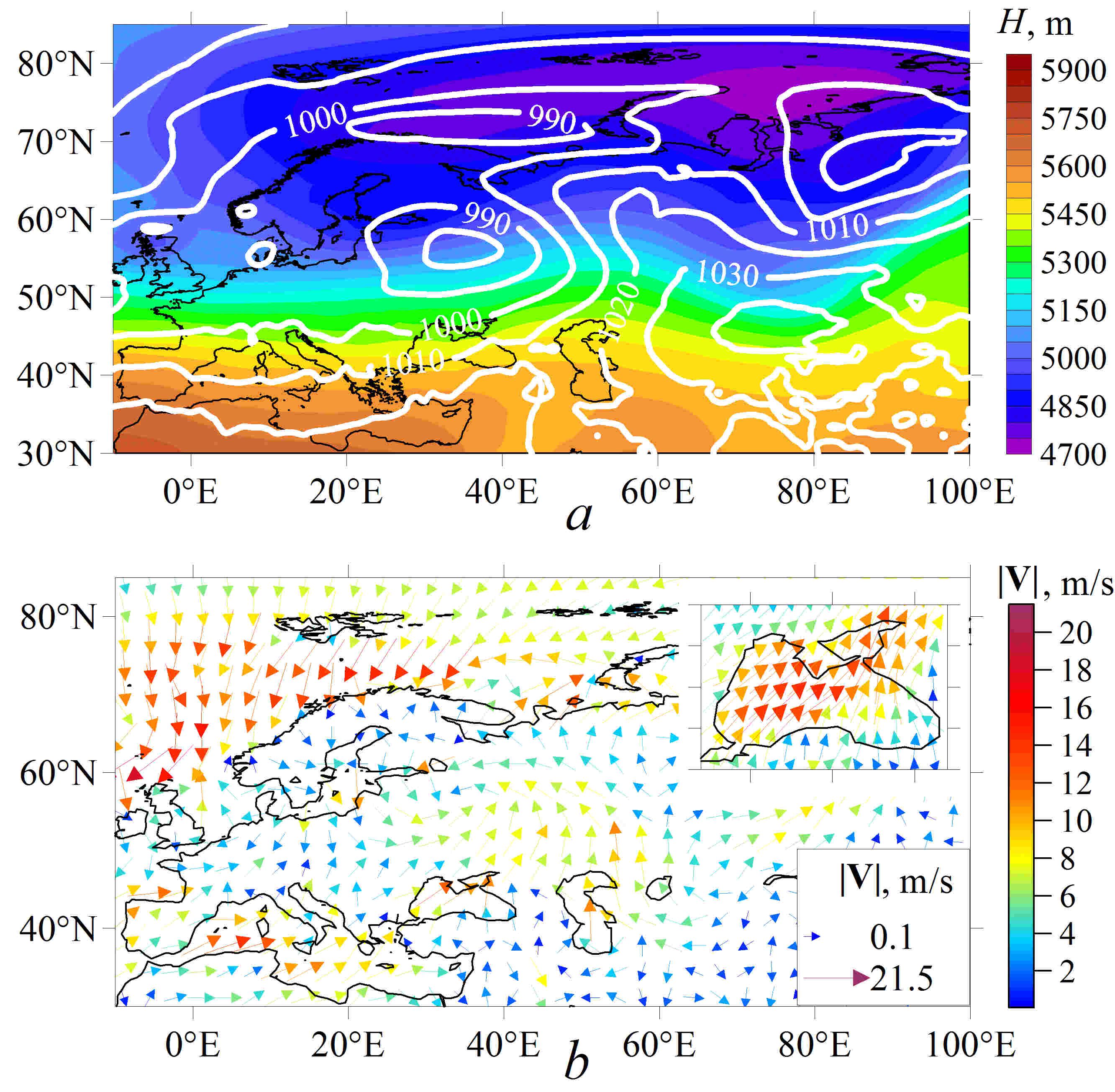 Since mid-January, a typical westerly movement of Atlantic cyclones over Central Europe was disrupted due to the strengthening of the Siberian anticyclone ridge, stretching from the south of the Urals, its subsequent movement to the north-west and merging with the high-altitude ridge over the north-eastern Atlantic [39, 40]. An extreme increase in positive surface pressure anomalies took place in the lower layer of the troposphere [41]. By the end of January – early February, an extensive high-altitude blocking anticyclone was located in the north of the European part of Russia (Fig. 3, a). At the Black Sea coast, frosts were accompanied by strong winds (Fig. 3, b). During the period under review, from 29 January to 2 February 2012, a northerly wind blew over the Black Sea with a mean speed of 7.4 m/s and maximum values of up to 15 m/s.