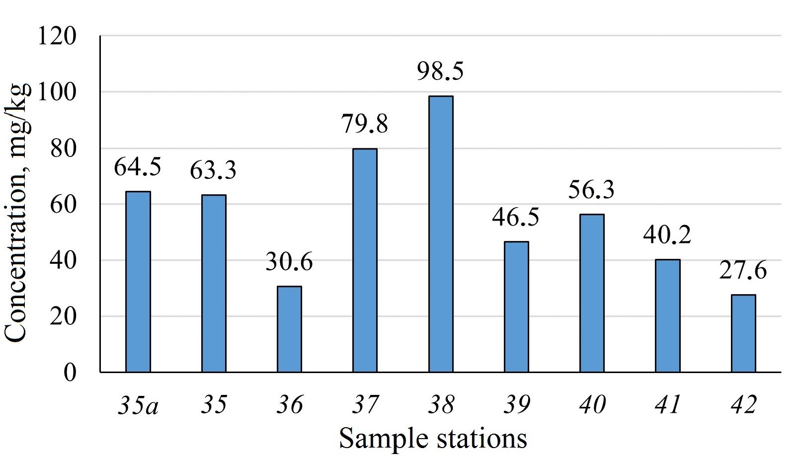 The distribution of hydrocarbon content in the bottom sediments of Kamyshovaya Bay exhibits considerable variation across all sampling stations, with a notable unevenness in the distribution across the water area (Fig. 2). The highest values were recorded in the central region of the bay (station 38, 98.5 mg/kg), followed by the apex (station 35a, 64.5 mg/kg) and the lowest in the area closest to the bay exit (station 42, 27.6 mg/kg).
