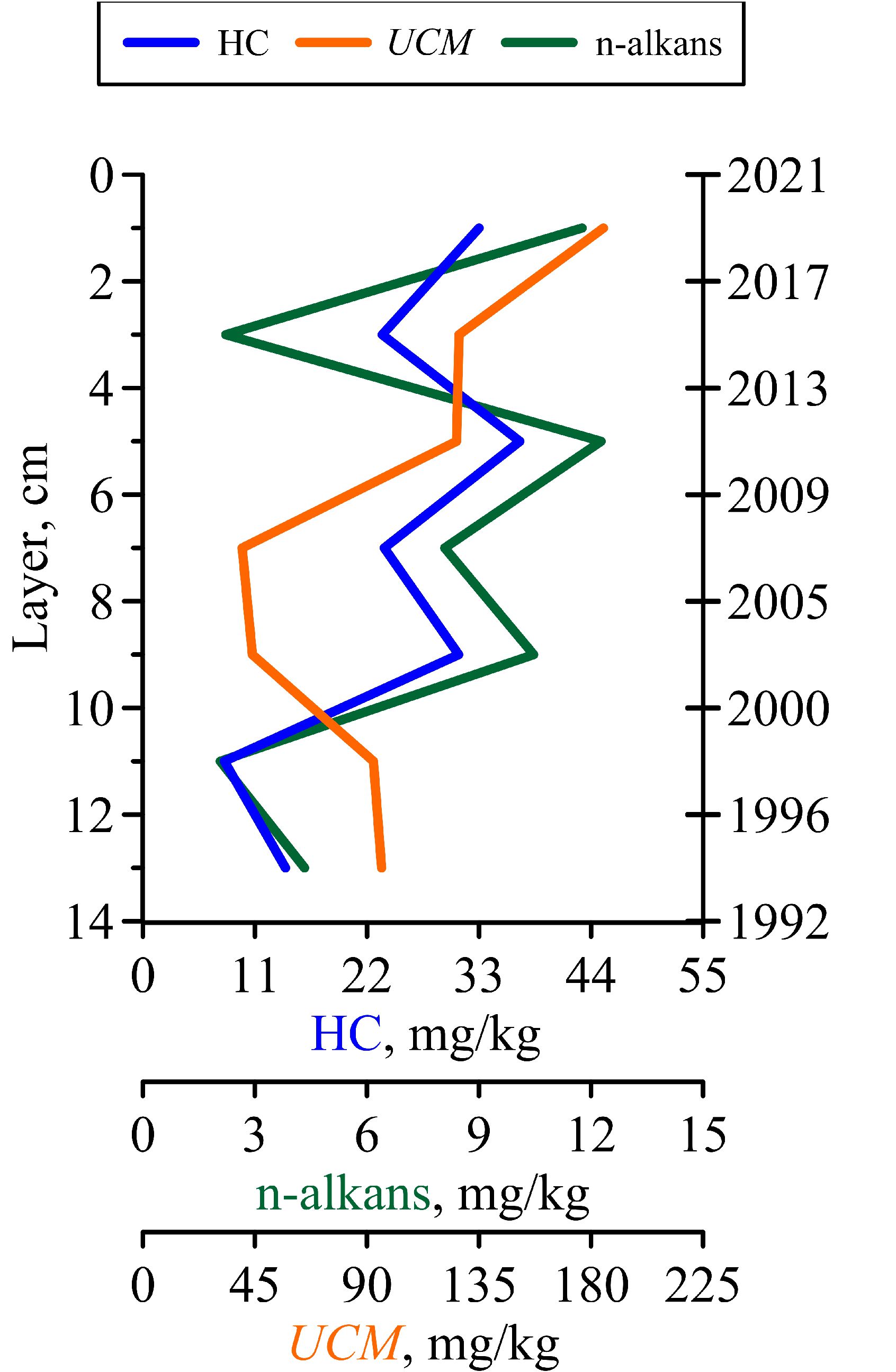 A chromatographically unresolved background was identified in all the layers under investigation. A gradual decline in the ‘hump’ was observed from the 0–2 cm layer (185 mg/kg) to the 6–8 cm layer (39.9 mg/kg), followed by an increase in the UCM concentration towards the 12–14 cm layer (95.9 mg/kg).The change in hydrocarbon, n-alkane and UCM content with depth was found to be uneven. The maximum concentration of hydrocarbons (37 mg/kg) was observed in the 4–6 cm layer, while the highest UCM values were in the 0–6 cm layer (125–185 mg/kg). This may be a consequence of changes in the intensity and nature of pollution, with the accumulation of an unresolved mixture in the bottom sediments serving as an indicator.