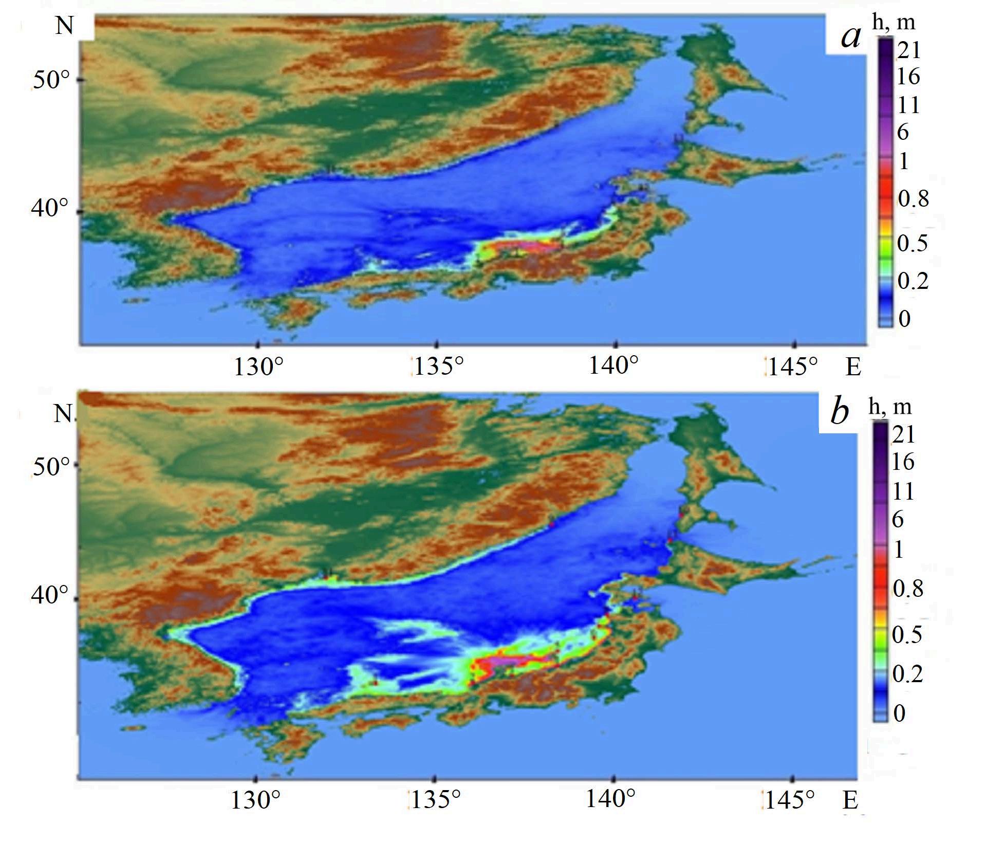 At the last seaward point at 5 m depth, a condition of total reflection (vertical wall) was set, which makes it possible to record the maximum and minimum wave level shift at this depth. Computational domain applied for these calculations was 125.01°– 147.00°E, 30.01°– 55.00°N with a grid of 30' ≈ 759 m step. In the numerical solution, we used a scheme constructed by analogy with the Sielecki one [3].