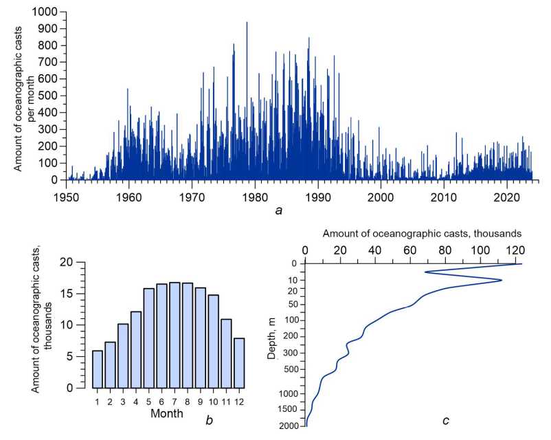 Fig.2. Amount of oceanographic casts in the Black Sea over 1950‒2023: distribution by years and months (а), months (b) and depth (c)