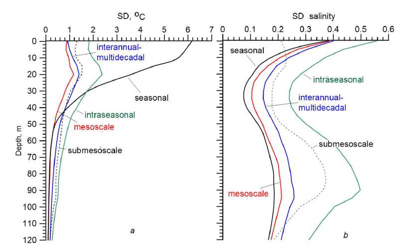 Fig.4. Vertical distribution of the Black Sea average estimates of temporal variability of different scales for water temperature (a) and salinity (b)