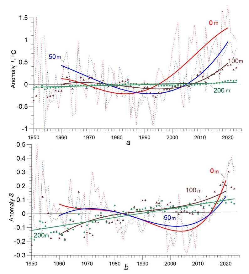 Fig.6. Time-series of the Black Sea average annual anomalies relative to climatic seasonal values at different depths for 1950–2023: water temperature (a) and salinity (b). Thin dashed lines and symbols show anomaly values, thick lines – polynomial approximation; individual depths are highlighted in different colors