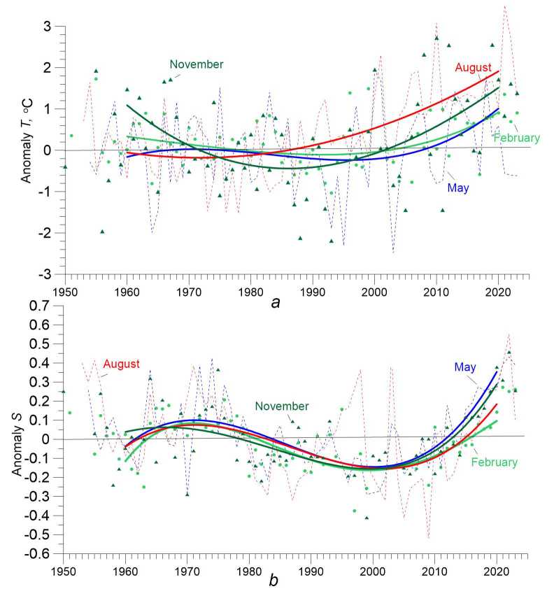 Fig.7. Time-series of the Black Sea average monthly anomalies relative to climatic values on the sea surface in the central months of hydrological seasons for 1950–2023: water temperature (a) and salinity (b). Thin dashed lines and symbols show anomaly values, thick lines –polynomial approximation; individual months are highlighted in different colors