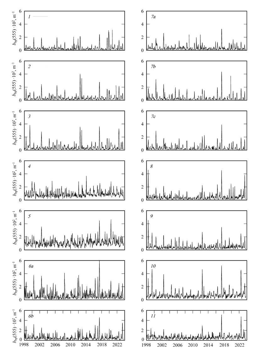 Data series (bbp(555), NEh, SST, Ca, aCDM(490) and ZUML), calculated with two-week averaging for each sea sub-region (Fig. 1) from 1998 to 2023, were obtained. Fig. 2 shows the dynamics of bbp(555) in each sub-region over the specified period. Seasonal and interannual variability in this parameter are evident in all sub-regions (Fig. 2).
