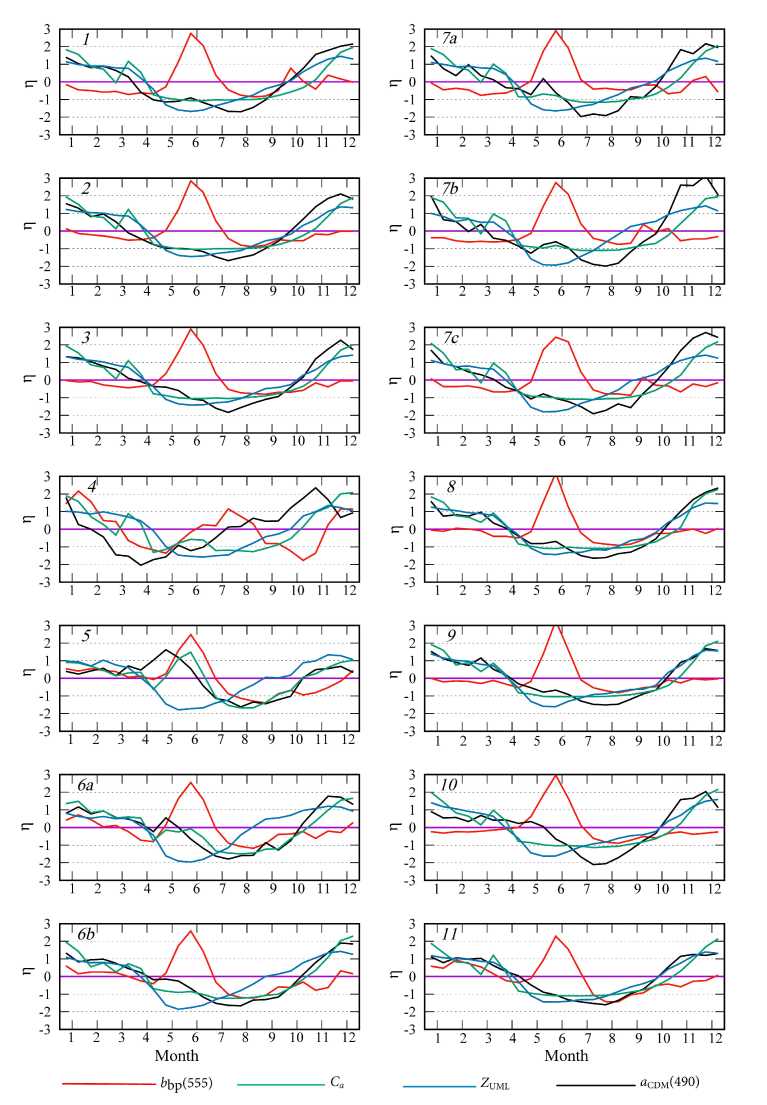 Fig.3. Normalized monthly mean anomalies (η) of the particulate backscattering coefficient at wavelength 555 nm (bbp(555)), concentration of chlorophyll a (Ca), thickness of the upper mixed layer (ZUML), coefficient of light absorption by colored detrital matter at wavelength 490 nm in particular sub-regions of the Black Sea