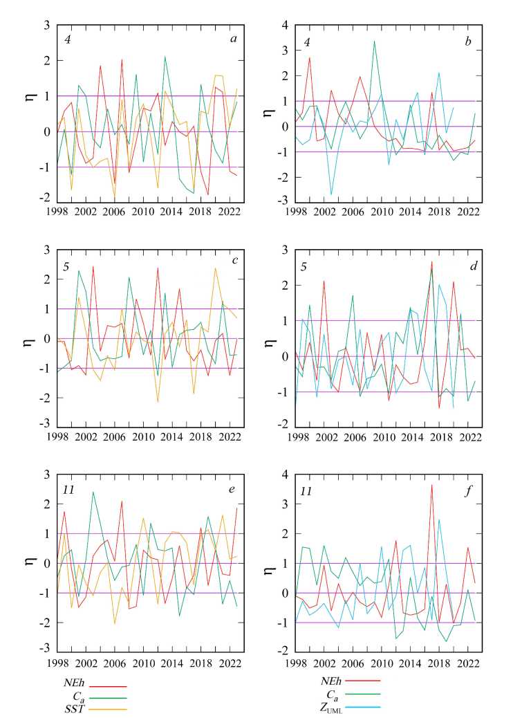 Fig.4. Interannual variability of normalized monthly mean anomalies (η) of G. huxleyi cell abundance (NEh), chlorophyll a concentration (Ca), sea surface temperature (SST), and thickness of the upper mixed layer (ZUML) in February (a, c, e), June (d, f) and August (b) in sub-regions 4, 5 and 11