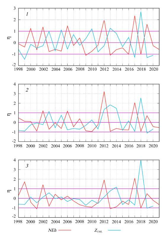A thorough analysis of the interannual variability of NEh and ZUML, calculated bbased on normalized anomaly values, reveals that the extremes of these two curves are in antiphase in the majority of cases (Fig. 5). A comparison of the mean of NEh and ZUML for June, obtained in different years, indicates an inverse relationship between these parameters, which is most pronounced at NEh values less than 1 (Fig. 6).
