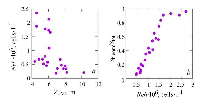 Fig.6. Relationship between the upper mixed layer thickness (ZUML) in June and the G. huxleyi cell abundance (NEh) in the western deep part (sub-region 1) (a), and between (NEh) in the deep part of the sea (sub-region 1 and 2) and “bloom” area to the total sea area ratio (Sbloom/Stot) (b)
