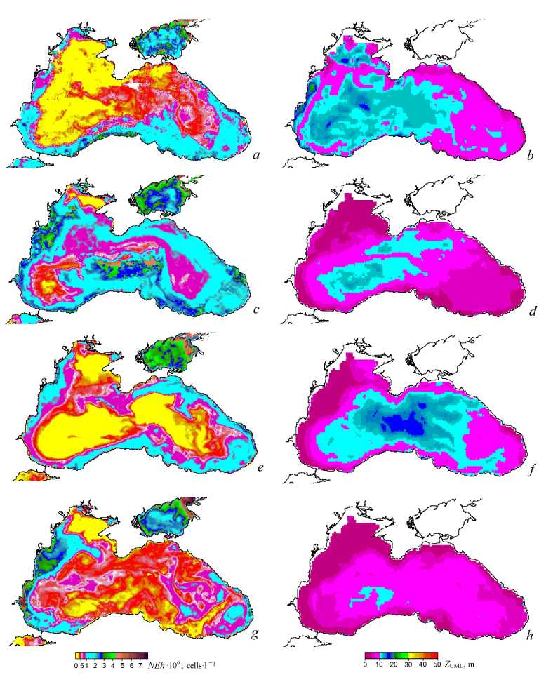 Fig.7. Maps of G. huxleyi cell abundance (NEh) (a, c, e, g) and upper mixed layer thickness (ZUML) (b, d, f, h) at the onset of “bloom” in the second half of May, 1998 (a, b), 2002 (c, d), 2004 (e, f), 2008 (g, h) (data on ZUML are from [32])