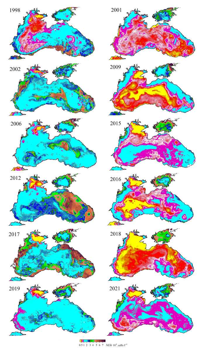 Fig.8. Maps of spatial distribution of G. huxleyi cell concentration (NEh) in the Black Sea surface layer: in the first half of June in 1998, 2002, 2005, 2006, 2012, 2017 (left), 2001, 2009, 2011, 2015, 2016, 2018, 2021 (right)