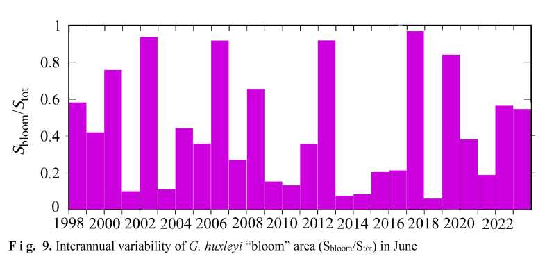 Fig.9. Interannual variability of G. huxleyi “bloom” area (Sbloom/Stot) in June