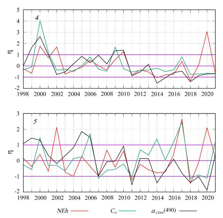 Fig.10. Interannual variability of normalized monthly mean anomalies of G. huxleyi “bloom” intensity (NEh), chlorophyll a concentration (Ca) and light absorption coefficient by colored detrital matter ( ) in June in sub-regions 4 and 5 in the Black Sea
