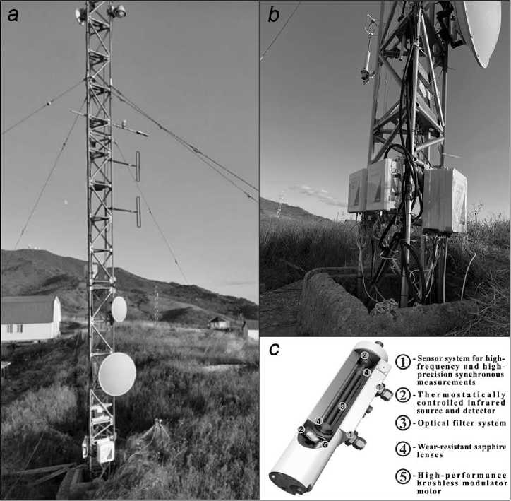 Stationary closed-type CO2/H2O gas analyzer LI-7200 RS. In 2023, an Eddy Covariance station based on the closed-type CO2/H2O gas analyzer LI-7200 RS, model LI-7200RSF, LI-COR, air flow module 7200-102 (Fig. 6, a), was installed at the Cape Shultz MES. The station is equipped with the SmartFlux 2 data processing system for Eddy Covariance systems in real time. The gas analyzer measurement frequency is 5–20 Hz. The CO2 measurement range is 0–3000 ppm. The sensitivity of CO2 measurements (mol H2O/mol CO2) ±0.02. The station is equipped with a high-precision digital 3-axis (3D) ultrasonic anemometer Gill Windmaster 3D for measuring turbulent flows. Its basic characteristics: sampling frequency – 20 Hz, range of measured wind speeds – 0–45 m/s, resolution – 0.01 m/s, 1.5% error (RMS) at 12 m/s, working range of wind directions – 0–359°, resolution – 0.1°, 2° error at 12 m/s, housing material – aluminum/carbon fiber. Equipment by LI-COR, closed-type CO2/H2O gas analyzer LI-7200RS is specially designed for high-speed and high-precision measurements of CO2 and water vapor concentrations in the atmosphere (Fig. 6, b). It combines the advantages of closed-type gas analyzers (high measurement accuracy, productivity, compactness and resistance to the most adverse conditions) with the low energy consumption of open-type gas analyzers.