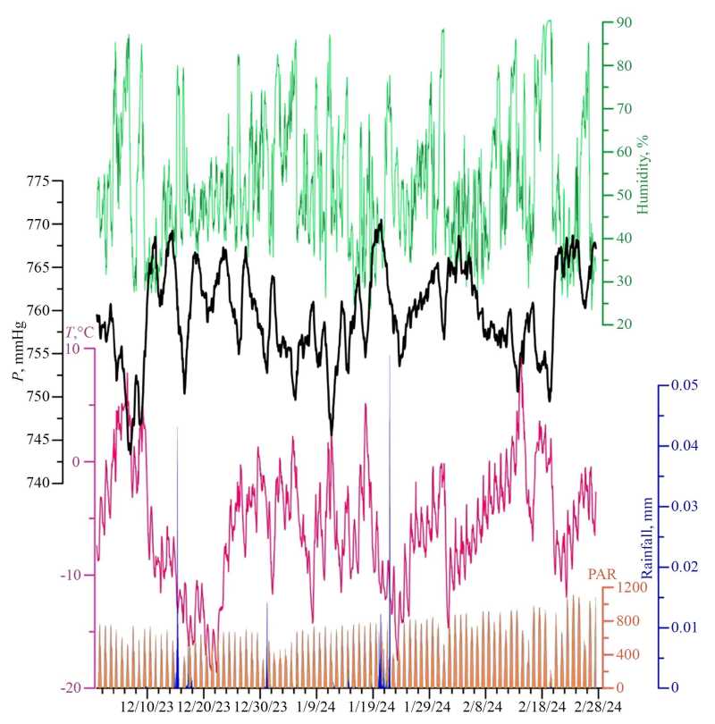 Fig.7. Results of meteorological monitoring at Cape Schultz MES for December 2023 – February 2024. Yellow color shows photosynthetically active radiation, blue – precipitation amount, red – temperature, black – atmospheric pressure, and green – humidity