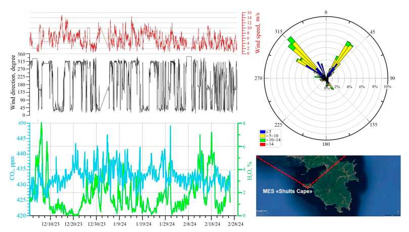 Fig.8. Results of gas-geochemical monitoring at Cape Schultz MES for December 2023 – February 2024. Red color shows wind speed, black – wind direction, blue – concentration of carbon dioxide, and green – concentration of water vapor